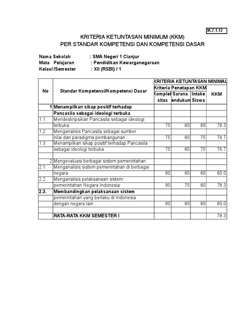 Sheet1 ik.7.1.12/pkn kriteria ketuntasan minimum (kkm) per standar kompetensi dan kompetensi dasar nama sekolah : Update terbaru rpp pkn smp ktsp 2006 berkarakter terbaru dilengkapi dengan silabus, prosem, kkm, pemetaan siap download dalam format word ka. Kompleksitas, sarana pendukun dan intake (kemampuan siswa). You can do the exercises online or download the worksheet as pdf. Format kkm pkn kelas vii k13 revisi ini untuk memudahkan guru menentukan standar nilai berdasarkan penilaian kriteria sekolah setempat.