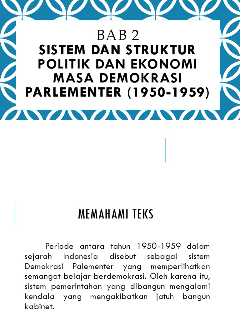 Terjadi inflasi yang tinggi terutama karena mengeluarkan uang dan membiayai. Perkembangan ekonomi dan politik masa demokrasi parlementer draft. Dalam rangka mengurangi jumlah uang yang beredar dan mengatasi defisit anggaran, pada tanggal 20 maret 1950, menteri keuangan, syafrudin prawiranegara, mengambil kebijakan memotong semua uang yang bernilai rp2,50 ke atas hingga nilainya tinggal setengahnya. Pada masa demokrasi parlementer, bangsa indonesia menghadapi berbagai permasalah ekonomi yang mencakup permasalahan jangka pendek dan jangka panjang yaitu untuk jangka pendek berupa tingginya jumlah uang yang beredar dan meningkatnya biaya hidup sedangkan jangka pajang yaitu pertambahan jumah penduduk yang tingkat kesejahteraannya rendah.maka dari itu, pemerintah melakukan beberapa upaya untuk. Masa ini berlangsung mulai 17 agustus 1950 sampai 6 juli 1959.